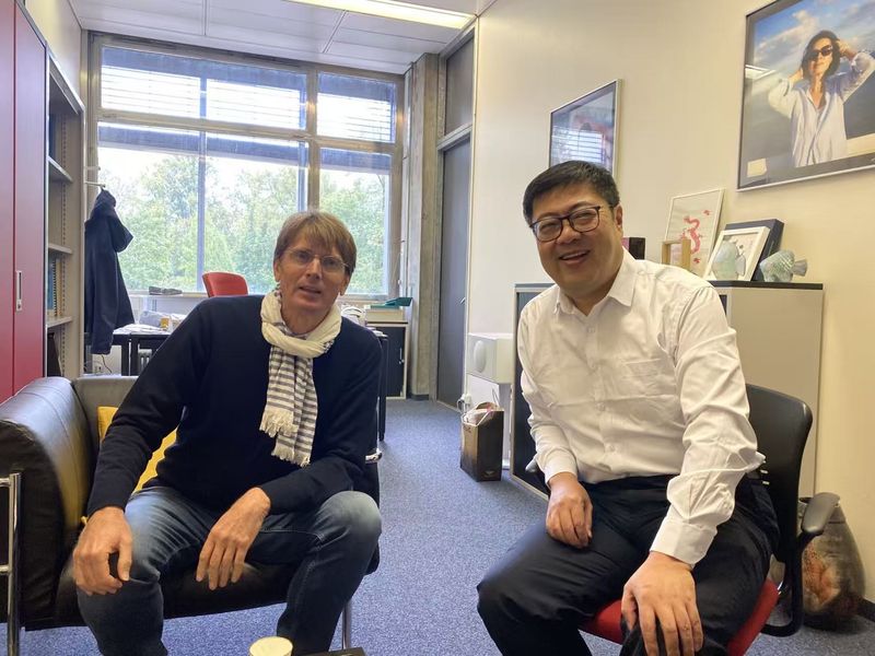 访问日内瓦大学期间,沈海涛一行与瑞士化学会分析科学主席、该校化学生物部副主任Eric Bakker教授会谈。沈海涛介绍学校化学化工领域学科进展,Bakker介绍电化学分析领域成果。双方商定共同申报项目,开展青年师生互访。代表团还看望该校终身副教授曹婵校友,并参观实验室。