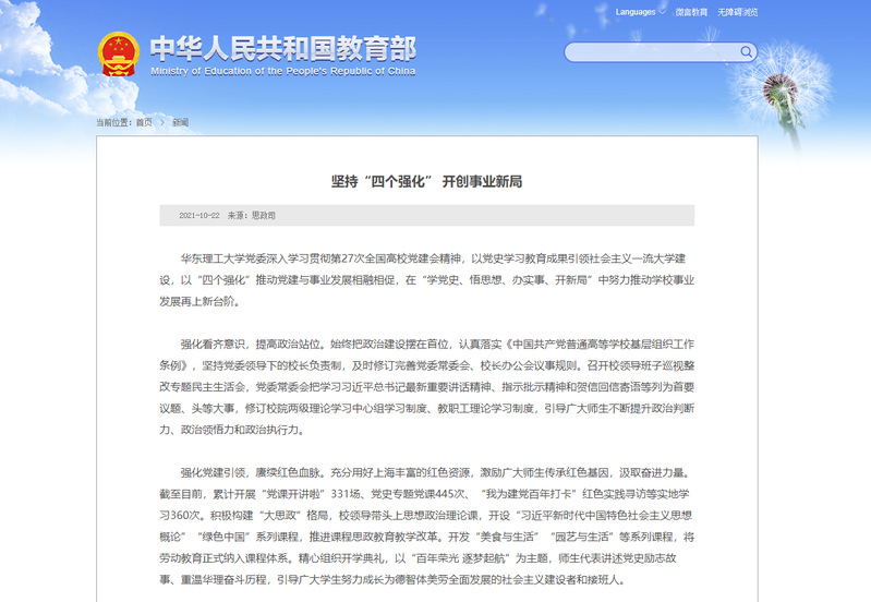 10月22日,教育部网站刊登了题为“坚持‘四个强化’ 开创事业新局”的简报,专题报道了学校党委深入学习贯彻第27次全国高校党建会精神,以党史学习教育成果引领社会主义一流大学建设,以“四个强化”推动党建与事业发展相融相促,在“学党史、悟思想、办实事、开新局”中努力推动学校事业发展的经验做法。