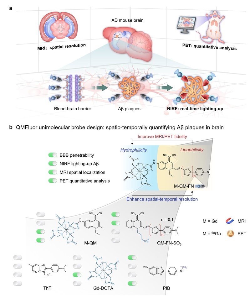 Recently, the top international academic journal in biomedical engineering, Nature Biomedical Engineering, published online a significant breakthrough by the research team of Academician Zhu Weihong and Professor Guo Zhiqian from the Photosensitive Products Research Center, School of Chemistry and Molecular Engineering, ECUST. The paper, titled “Multiplex imaging of amyloid-β plaques dynamics in living brains with quinoline-malononitrile-based probes” focuses on ultrasensitive molecular probes for imaging amyloid-β (Aβ) plaques in the brain.